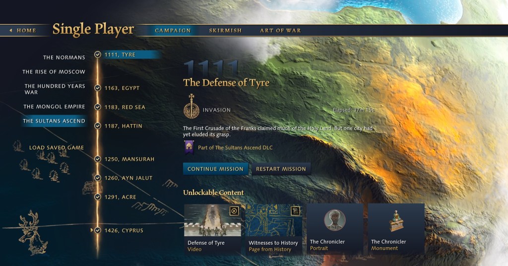 In between these two points, the game attempts to cover many of the major events in the history of the Crusades for the Islamic powers, primarily centred around two Egyptian groups: the Ayyubid dynasty and the Mamluk Sultanate.
