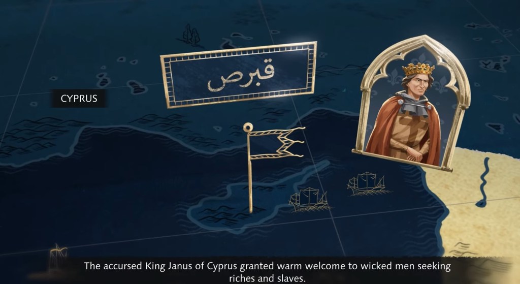 There is also the game’s final mission, the invasion of Cyprus. Done in response to systematic naval raids on the Egyptian and Syrian coastline, the narrator is personally invested this time as it involves his family, who were taken prisoner. King Janus of Cyprus acts as a convenient scapegoat for the Chronicler to blame and condemn for launching these attacks, but his involvement with this piracy was nuanced. Janus had attempted to organise numerous treaties with the Mamluks, but with pressure from his own nobles and brother, Henry of Galilee, to promote piracy, combined with a decline in royal revenues, the king decided to renew raids on Mamluk territories.