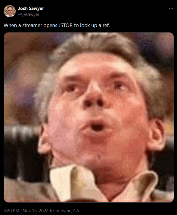 Once I have a well-formed question derived from the game, I’m able to go find some scholarship to help answer it. On-stream, I don’t really do my due diligence, sticking to one major source that seems representative to me. Reading silently makes for terrible content!